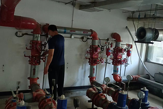 三、檢查消防供水設(shè)施:消防水池外觀,消防水箱外觀,消防水泵及控制柜工作狀態(tài),穩(wěn)壓泵、增壓泵、氣壓水罐工作狀態(tài),水泵結(jié)合器外觀、標識,管網(wǎng)控制閥門啟閉狀態(tài),泵房工作環(huán)境。